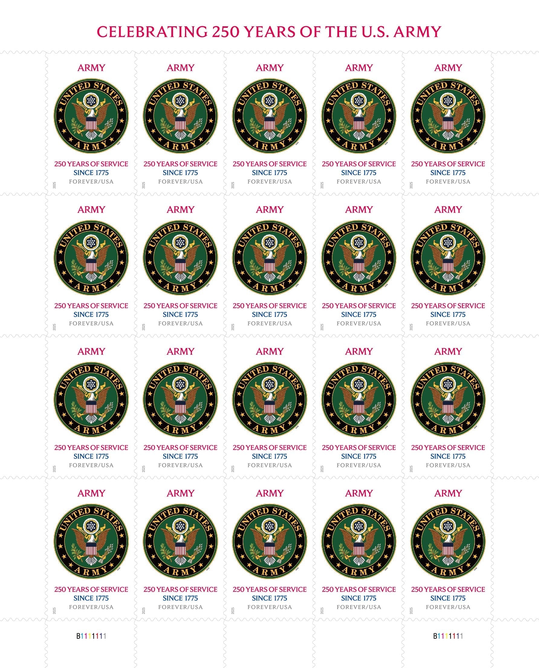 This stamp features the United States Army Symbol against a white background. The Army Symbol shows the Great Seal of the United States with the words “UNITED STATES” on its top edge. four stars on each of the side edges. and “ARMY” on its bottom edge. The word “ARMY” appears in red above the Army Symbol at the top of the stamp. Below the Army Symbol. text reads “250 YEARS OF SERVICE” in red. “SINCE 1775” in blue. and “FOREVER/USA” in smaller gray type. “CELEBRATING 250 YEARS OF THE U.S. ARMY” appears in red on the top of the stamp pane.